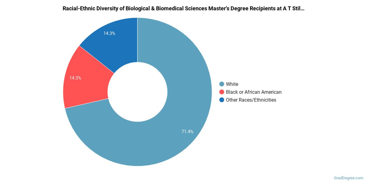 Of the students who received a biological and biomedical sciences master's degree from A T Still University of Health Sciences, 71% were white. This is above average for this degree on the natiowide level.