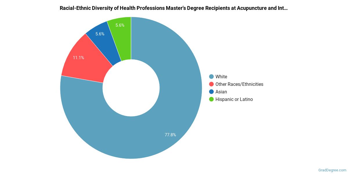 Of the students who received a health professions master's degree from Acupuncture and Integrative Medicine College - Berkeley, 78% were white. This is above average for this degree on the natiowide level.
