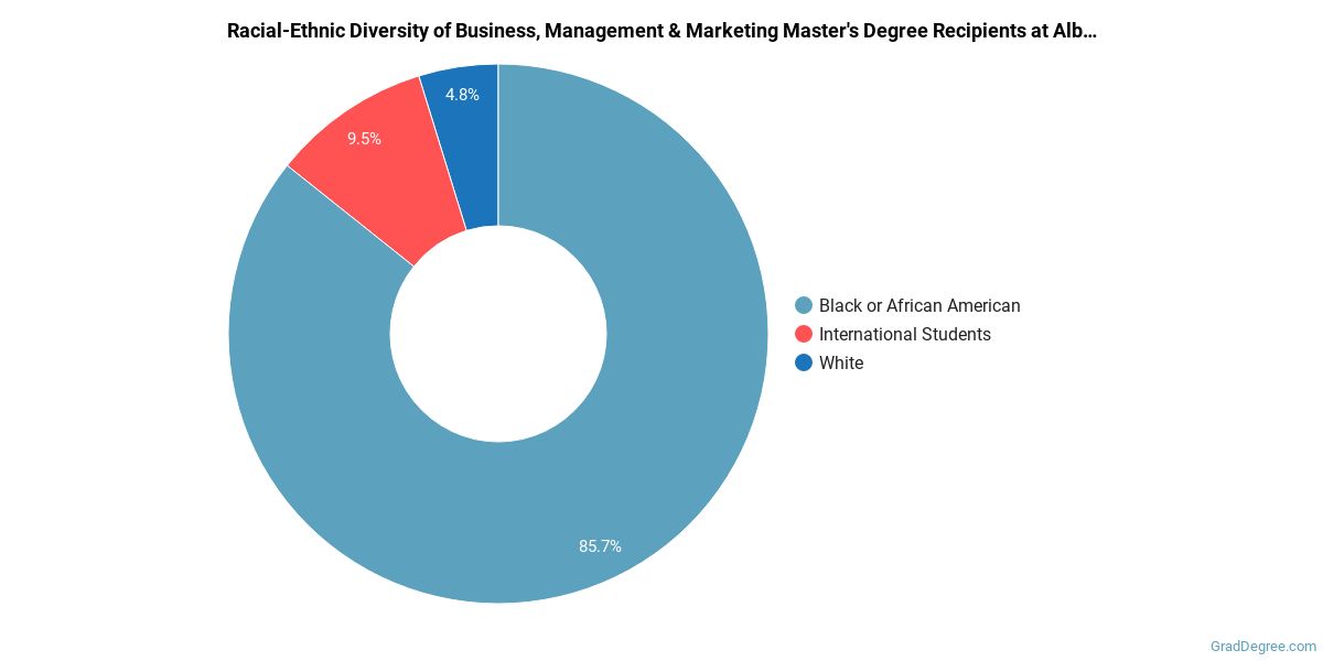 What traits are you looking for in a business, management and marketing school? To help you decide if Albany State University is right for you, we've gathered the following information about the school's business, management and marketing program.Albany State is located in Albany, Georgia and has a total student population of 6,509. During the 2020-2021 academic year, 21 students received their master's degree in business, management and marketing.