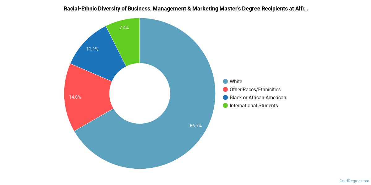 Of the students who received a business, management and marketing master's degree from Alfred, 67% were white. This is above average for this degree on the natiowide level.