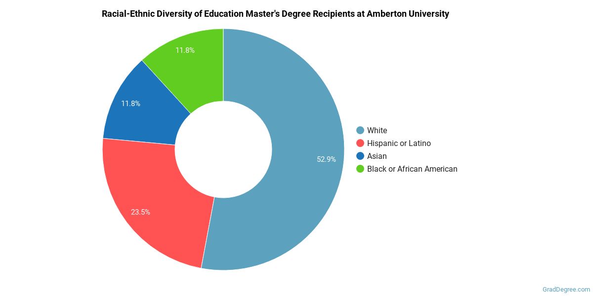 Of the students who received a education master's degree from Amberton, 53% were white. This is below average for this degree on the natiowide level. In the education master's program at this school, racial-ethnic minorities make up 47% of degree recipients. That is 17% better than the national average.*