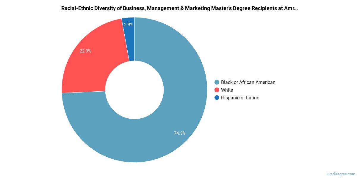 In the business, management and marketing master's program at this school, racial-ethnic minorities make up 77% of degree recipients. That is 45% better than the national average.*