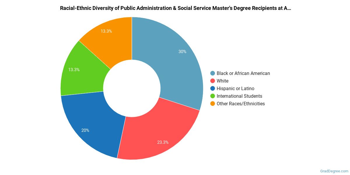 In the public administration and social service master's program at this school, racial-ethnic minorities make up 53% of degree recipients. That is 11% better than the national average.*