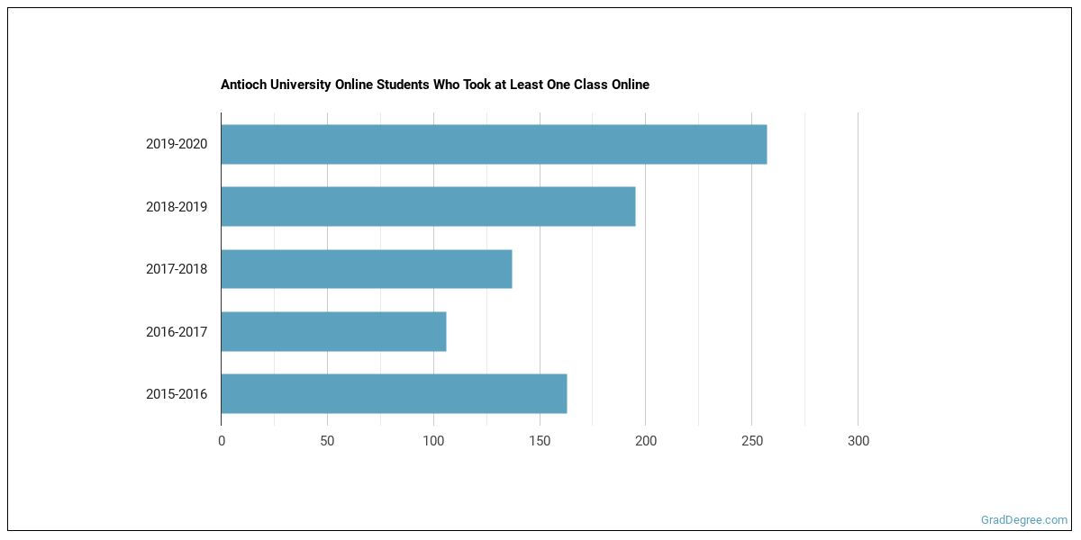 The average growth rate over the last four years of online students at Antioch University Online was 2,650.8%. This is the #52 largest growth rate of all schools that are mostly online. This refers to all students at Antioch University Online regardless of major.