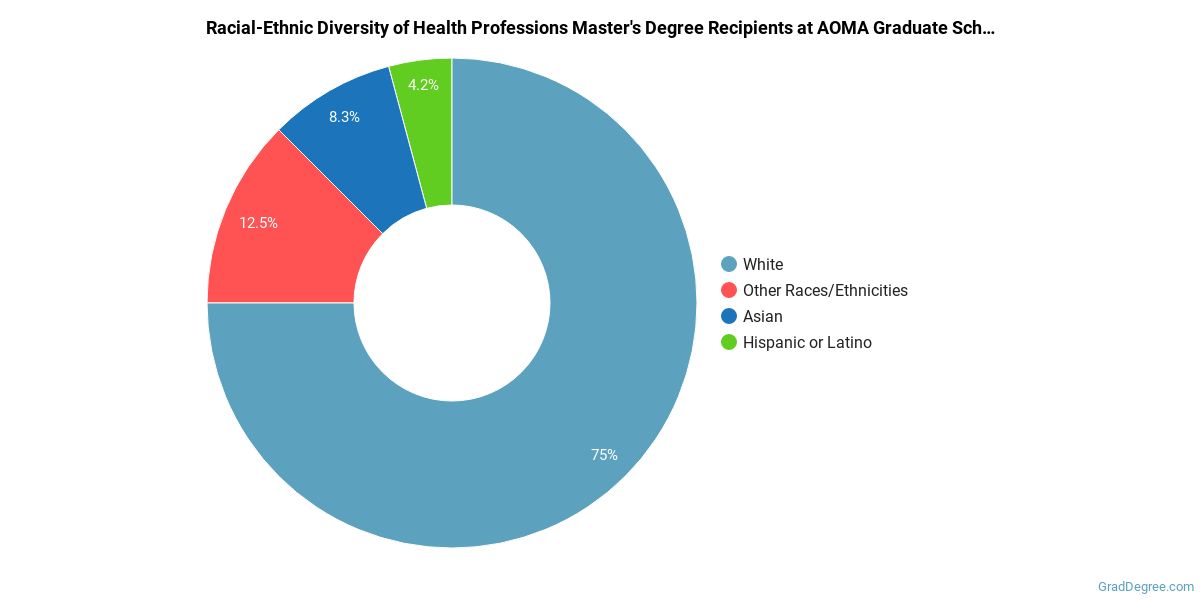 Of the students who received a health professions master's degree from AOMA, 75% were white. This is above average for this degree on the natiowide level.
