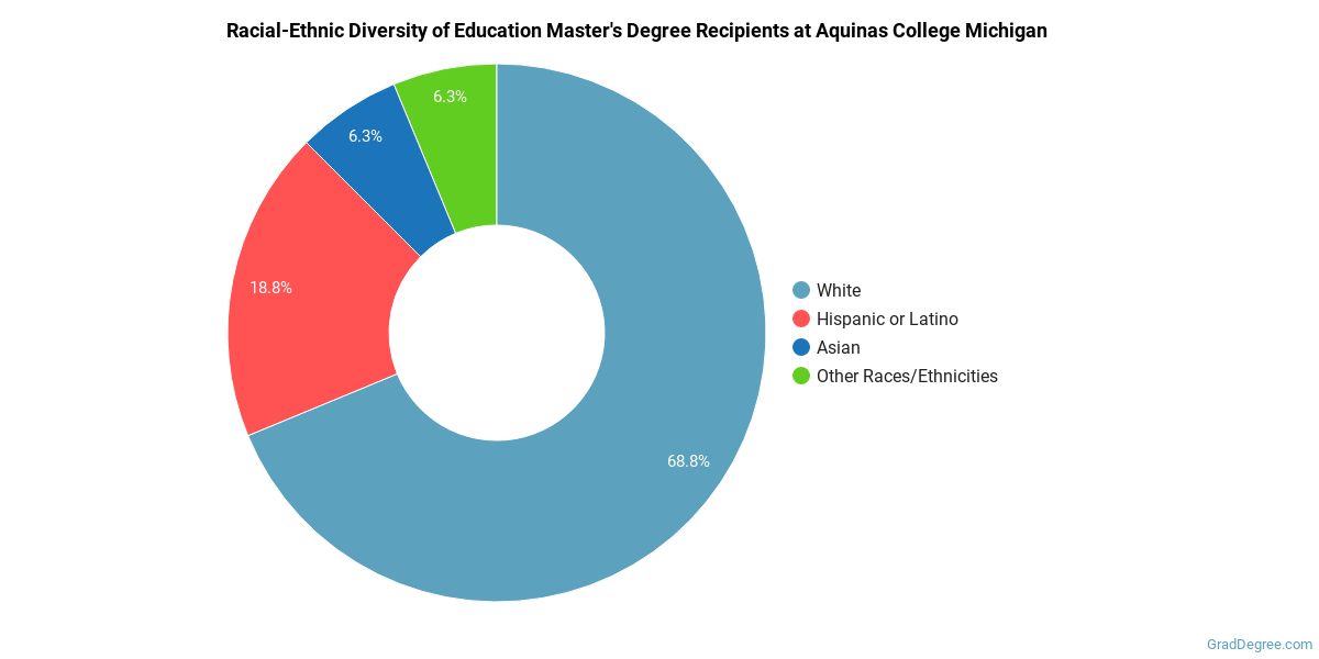 Of the students who received a education master's degree from Aquinas College Michigan, 69% were white. This is above average for this degree on the natiowide level.