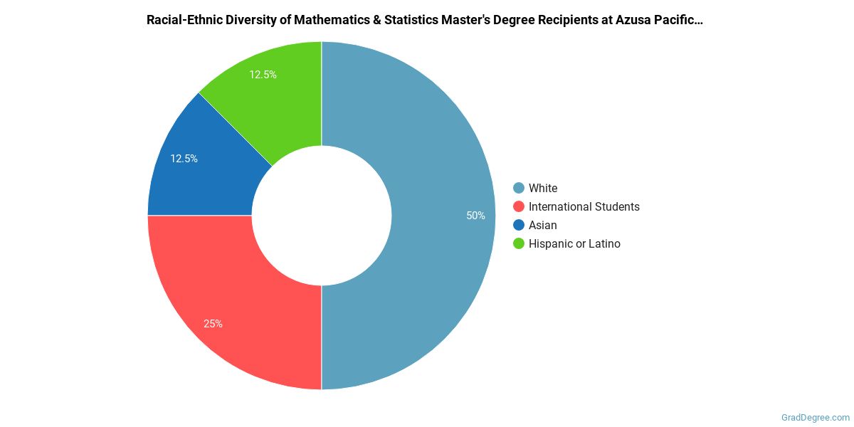 The following table and chart show the race/ethnicity for students who recently graduated from Azusa Pacific University with a master's in mathematics and statistics.