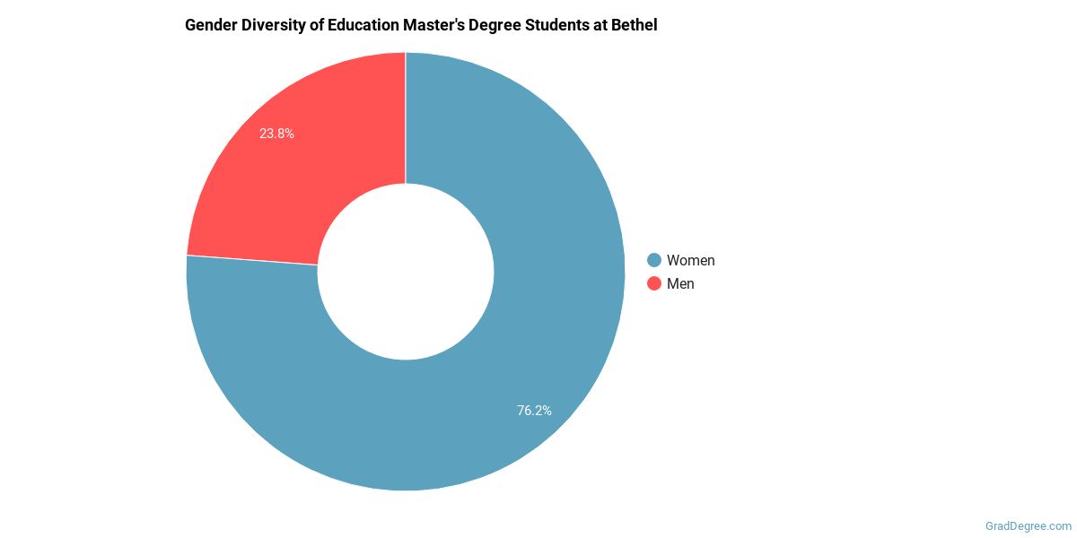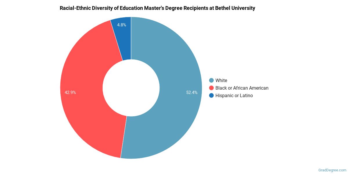 Of the students who received a education master's degree from Bethel, 52% were white. This is below average for this degree on the natiowide level. In the education master's program at this school, racial-ethnic minorities make up 48% of degree recipients. That is 18% better than the national average.*