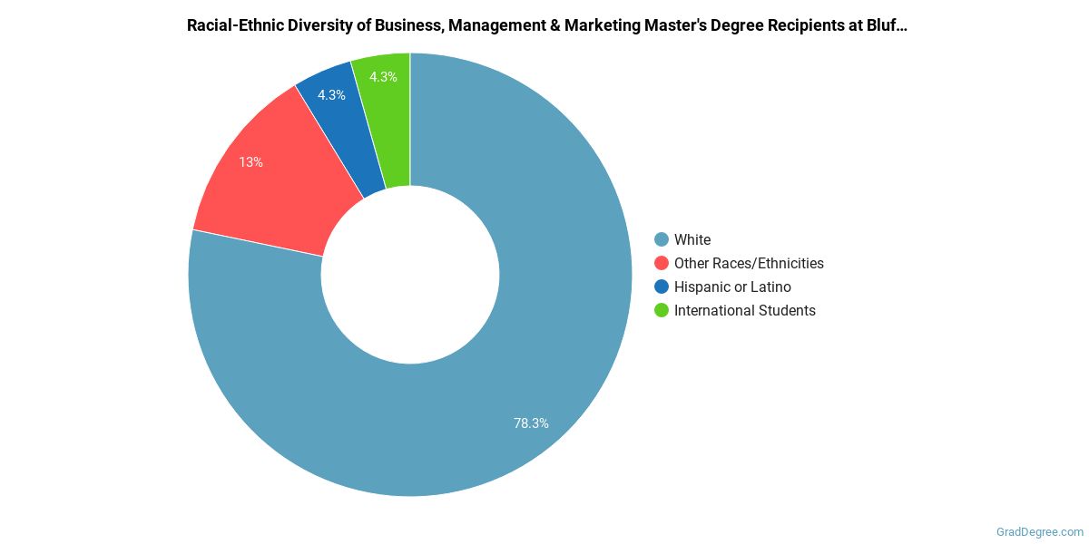 Of the students who received a business, management and marketing master's degree from Bluffton, 78% were white. This is above average for this degree on the natiowide level.