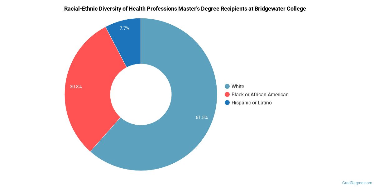 Of the students who received a health professions master's degree from Bridgewater, 62% were white. This is above average for this degree on the natiowide level. In the health professions master's program at this school, racial-ethnic minorities make up 38% of degree recipients. That is 3% better than the national average.*