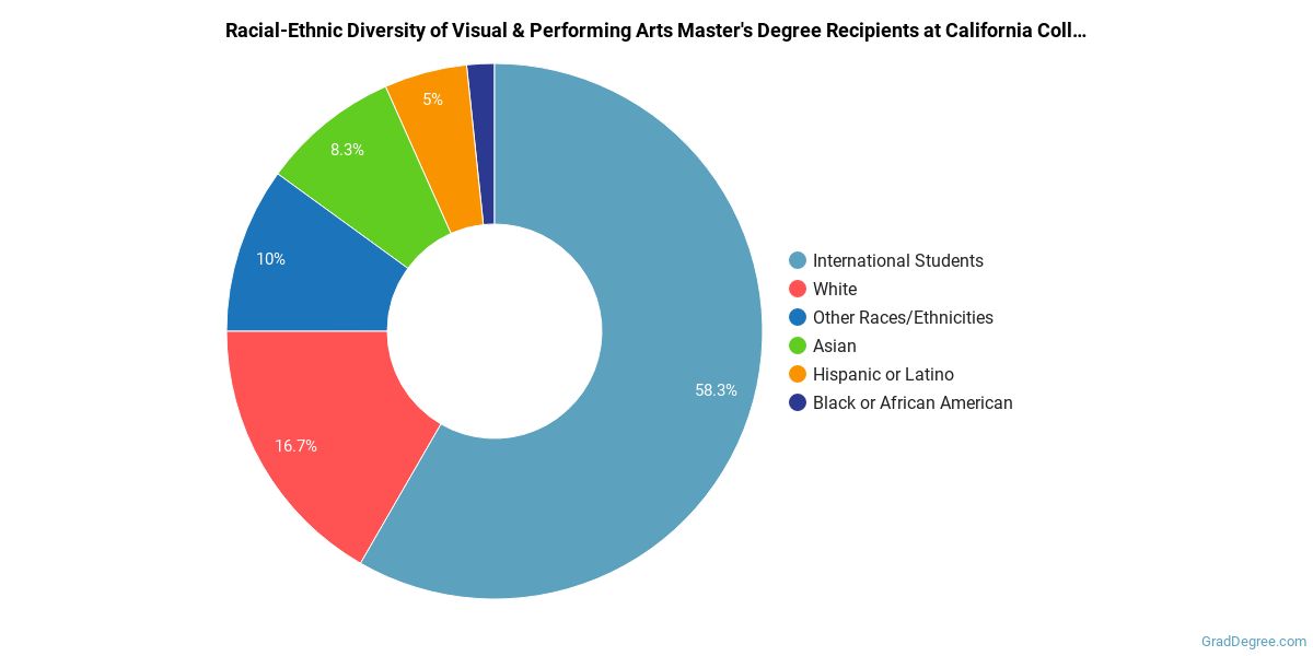 The following table and chart show the race/ethnicity for students who recently graduated from California College of the Arts with a master's in visual and performing arts.