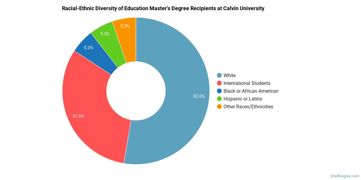 Of the students who received a education master's degree from Calvin, 53% were white. This is below average for this degree on the natiowide level.