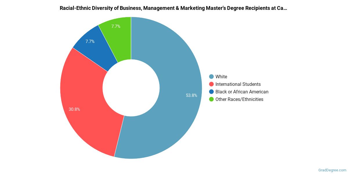 Of the students who received a business, management and marketing master's degree from Cameron University, 54% were white. This is above average for this degree on the natiowide level.