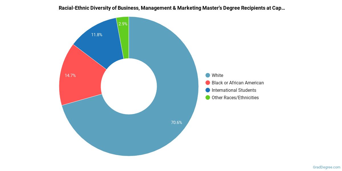Of the students who received a business, management and marketing master's degree from Capital, 71% were white. This is above average for this degree on the natiowide level.