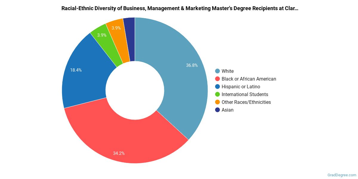 The following table and chart show the race/ethnicity for students who recently graduated from Claremont Lincoln University with a master's in business, management and marketing.
