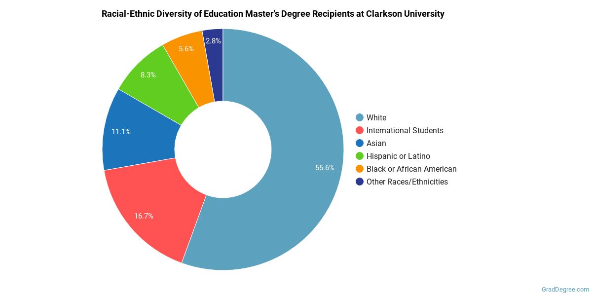 Of the students who received a education master's degree from Clarkson, 56% were white. This is below average for this degree on the natiowide level.