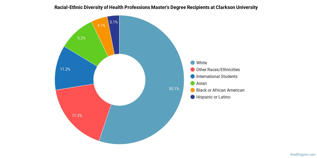 Of the students who received a health professions master's degree from Clarkson, 55% were white. This is typical for this degree on the natiowide level.