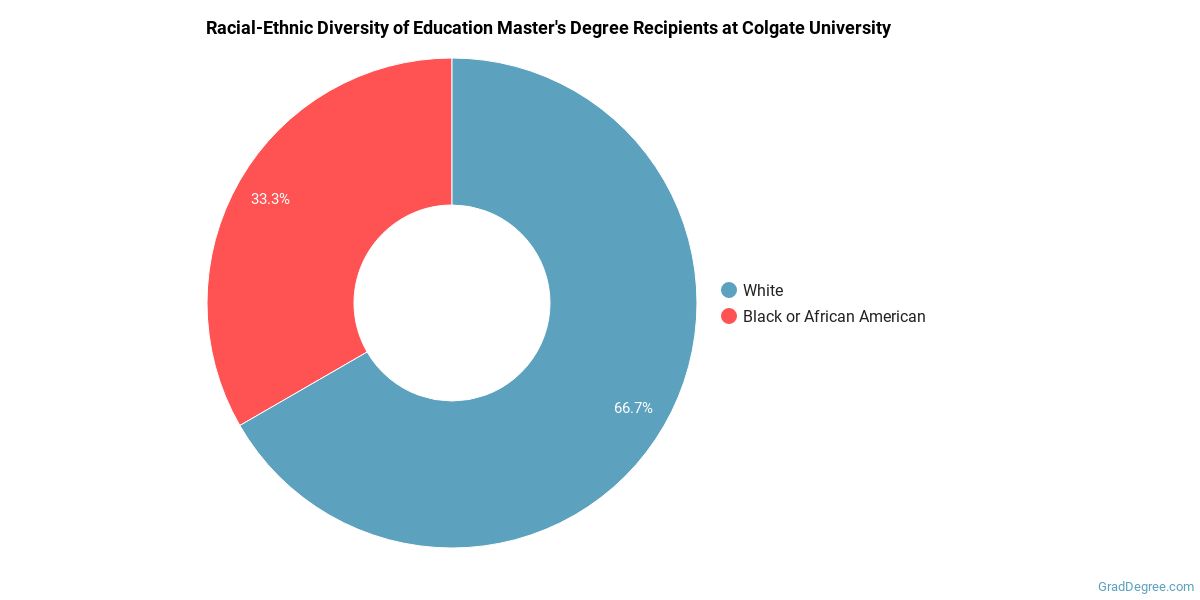 Of the students who received a education master's degree from Colgate, 67% were white. This is above average for this degree on the natiowide level. In the education master's program at this school, racial-ethnic minorities make up 33% of degree recipients. That is 3% better than the national average.*