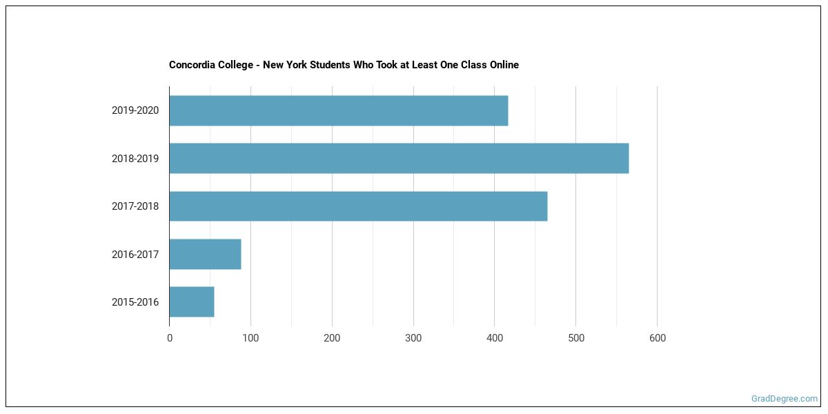 The average growth rate over the last four years of online students at Concordia College - New York was 29.8%. This is the #522 largest growth rate of all schools that are only partially online. This refers to all students at Concordia College - New York regardless of major.