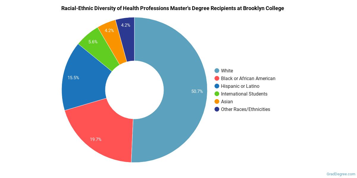 Of the students who received a health professions master's degree from Brooklyn College, 51% were white. This is below average for this degree on the natiowide level. In the health professions master's program at this school, racial-ethnic minorities make up 44% of degree recipients. That is 8% better than the national average.*