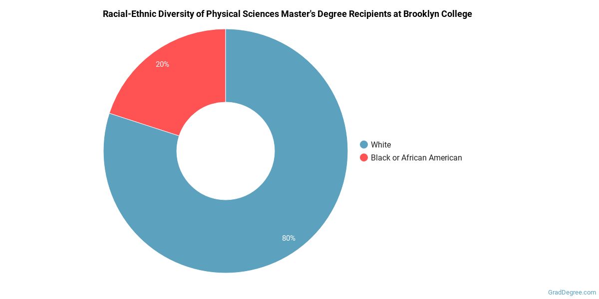 Of the students who received a physical sciences master's degree from Brooklyn College, 80% were white. This is above average for this degree on the natiowide level. In the physical sciences master's program at this school, racial-ethnic minorities make up 20% of degree recipients. That is 3% better than the national average.*