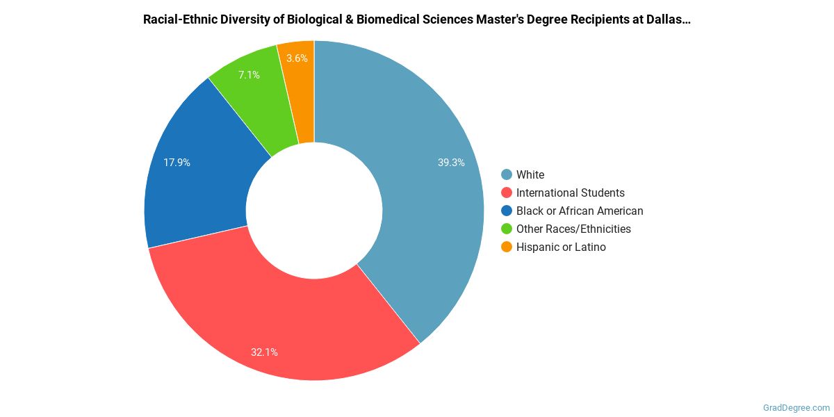 The following table and chart show the race/ethnicity for students who recently graduated from Dallas Baptist University with a master's in biological and biomedical sciences.