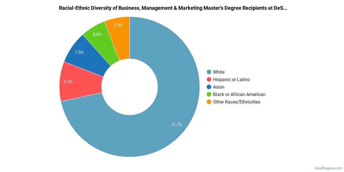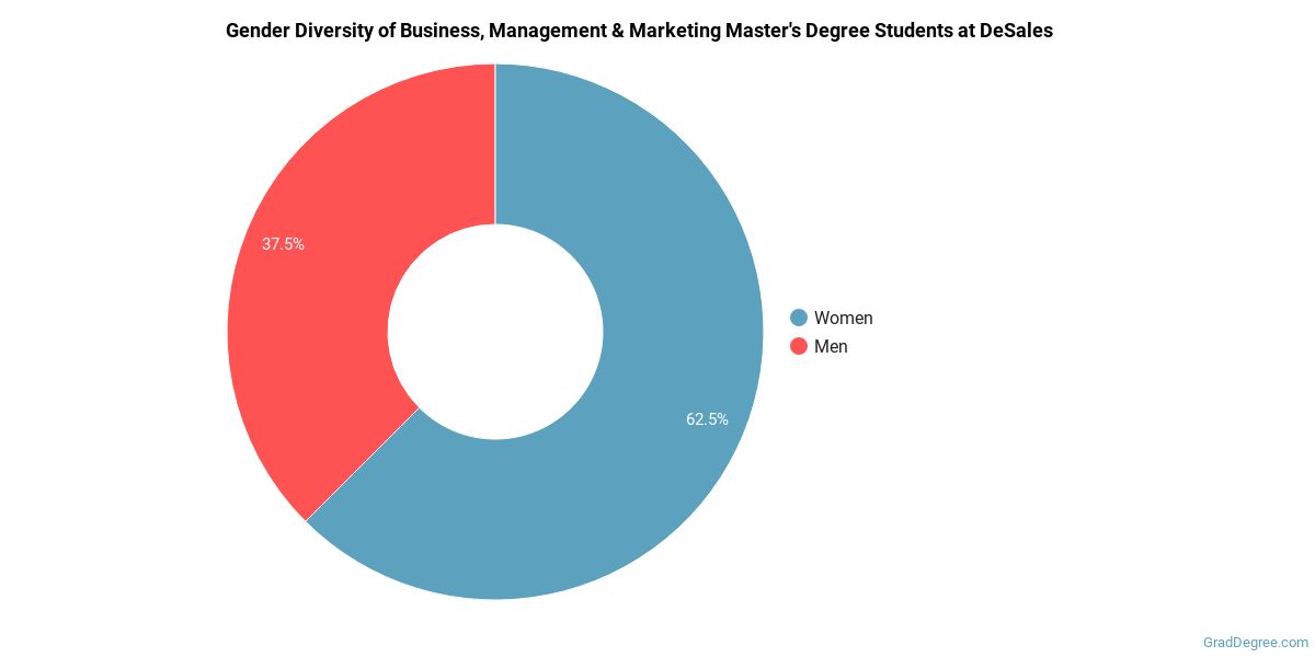 Of the students who received a business, management and marketing master's degree from DeSales, 72% were white. This is above average for this degree on the natiowide level.