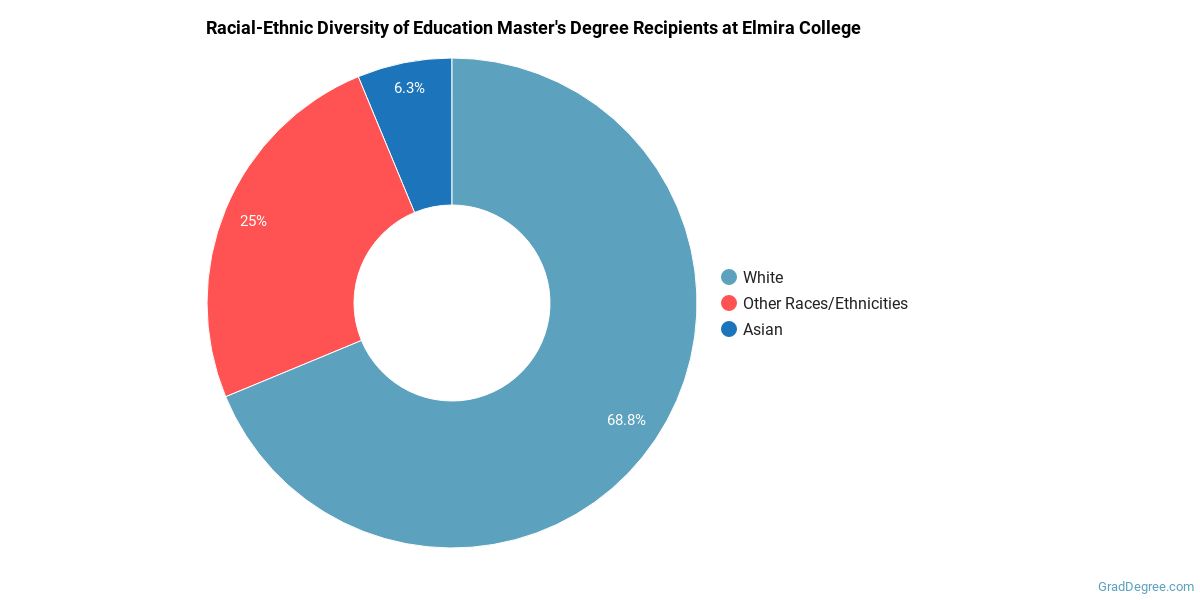 Of the students who received a education master's degree from Elmira, 69% were white. This is above average for this degree on the natiowide level.