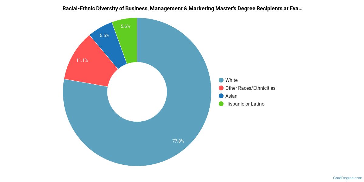 Of the students who received a business, management and marketing master's degree from Evangel, 78% were white. This is above average for this degree on the natiowide level.