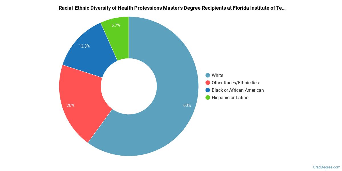 Of the students who received a health professions master's degree from Florida Institute of Technology - Online, 60% were white. This is above average for this degree on the natiowide level.