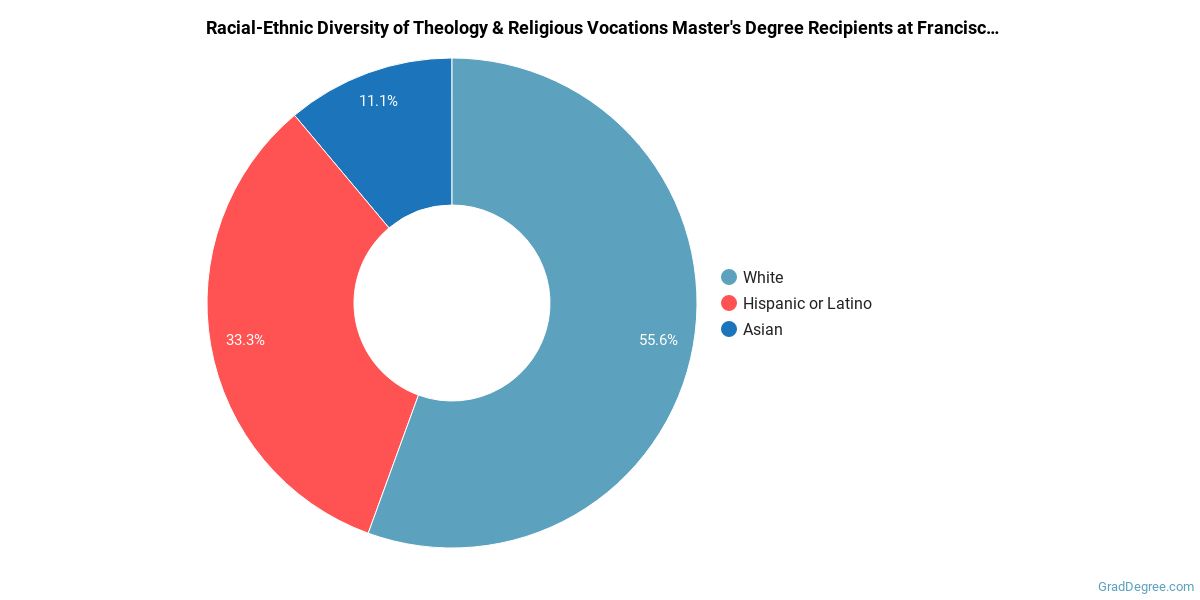 Of the students who received a theology and religious vocations master's degree from FST, 56% were white. This is typical for this degree on the natiowide level. In the theology and religious vocations master's program at this school, racial-ethnic minorities make up 44% of degree recipients. That is 15% better than the national average.*