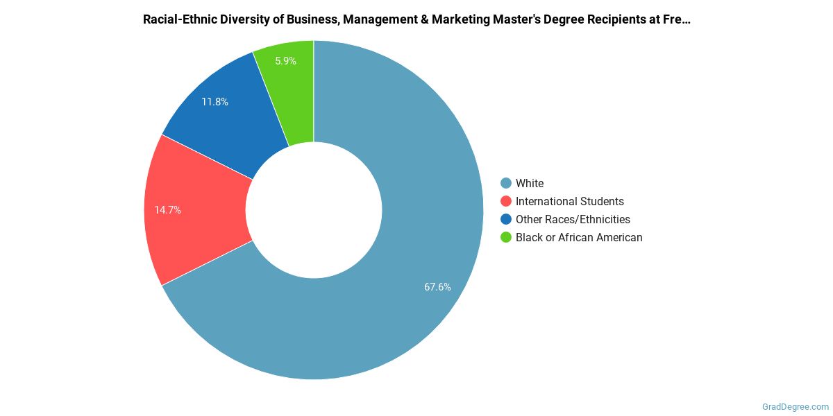 Of the students who received a business, management and marketing master's degree from FHU, 68% were white. This is above average for this degree on the natiowide level.