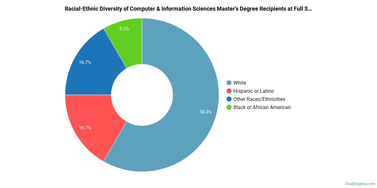 Of the students who received a computer and information sciences master's degree from Full Sail University, 58% were white. This is above average for this degree on the natiowide level. In the computer and information sciences master's program at this school, racial-ethnic minorities make up 25% of degree recipients. That is 4% better than the national average.*