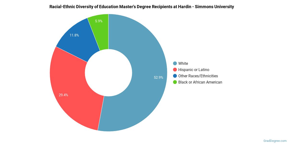 Of the students who received a education master's degree from Hardin - Simmons, 53% were white. This is below average for this degree on the natiowide level. In the education master's program at this school, racial-ethnic minorities make up 47% of degree recipients. That is 17% better than the national average.*