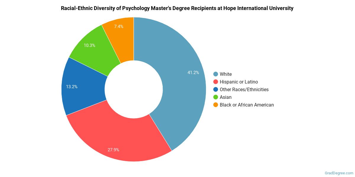 Every psychology school has its own distinct culture and strengths. We've pulled together some statistics and other details to help you see how the psychology program at Hope International University stacks up to those at other schools.Hope is located in Fullerton, California and has a total student population of 1,201. During the 2020-2021 academic year, 68 students received their master's degree in psychology.