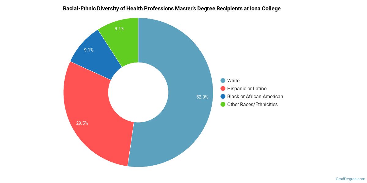 Of the students who received a health professions master's degree from Iona, 52% were white. This is typical for this degree on the natiowide level. In the health professions master's program at this school, racial-ethnic minorities make up 41% of degree recipients. That is 6% better than the national average.*