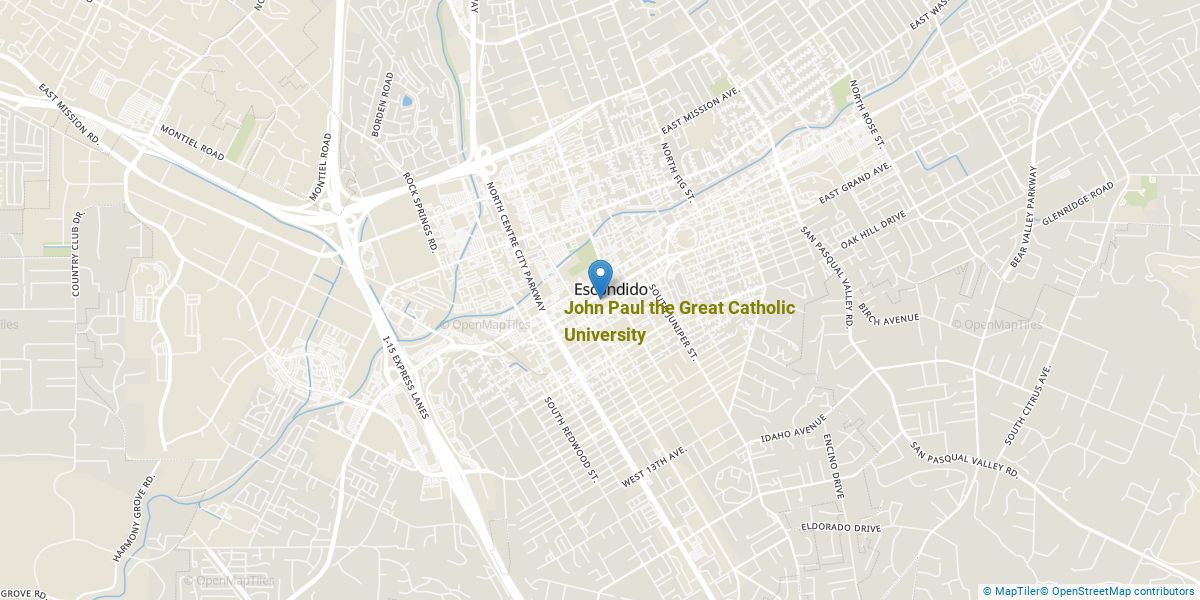 John Paul the Great Catholic University is a private not-for-profit institution located in Escondido, California. Escondido is considered a suburb and offers tranquility and safety near the excitement of a city center.