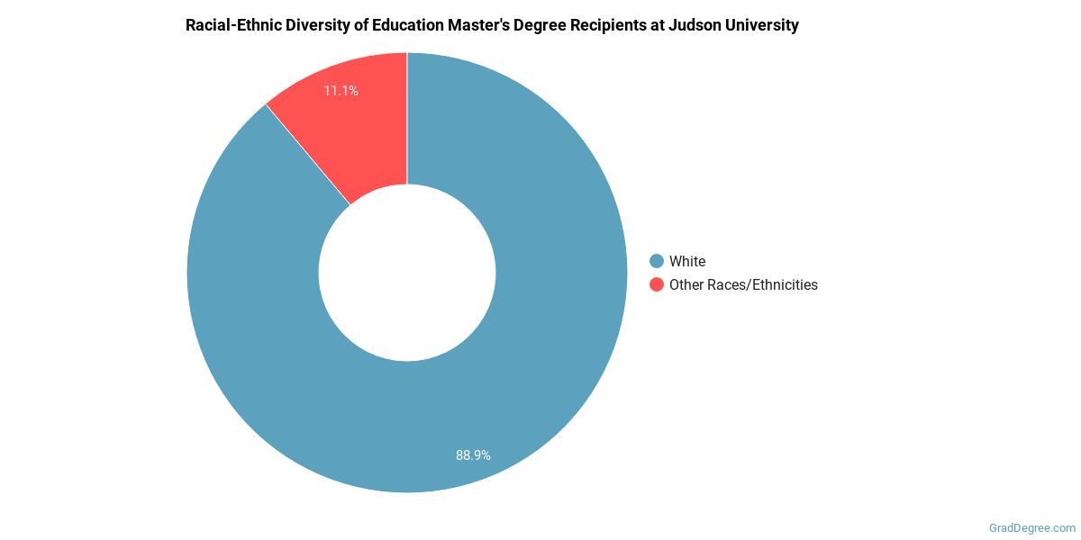 Of the students who received a education master's degree from Judson, 89% were white. This is above average for this degree on the natiowide level.