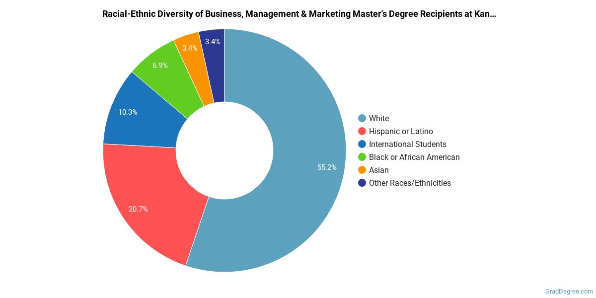 Of the students who received a business, management and marketing master's degree from Kansas Wesleyan University, 55% were white. This is above average for this degree on the natiowide level. In the business, management and marketing master's program at this school, racial-ethnic minorities make up 34% of degree recipients. That is 3% better than the national average.*