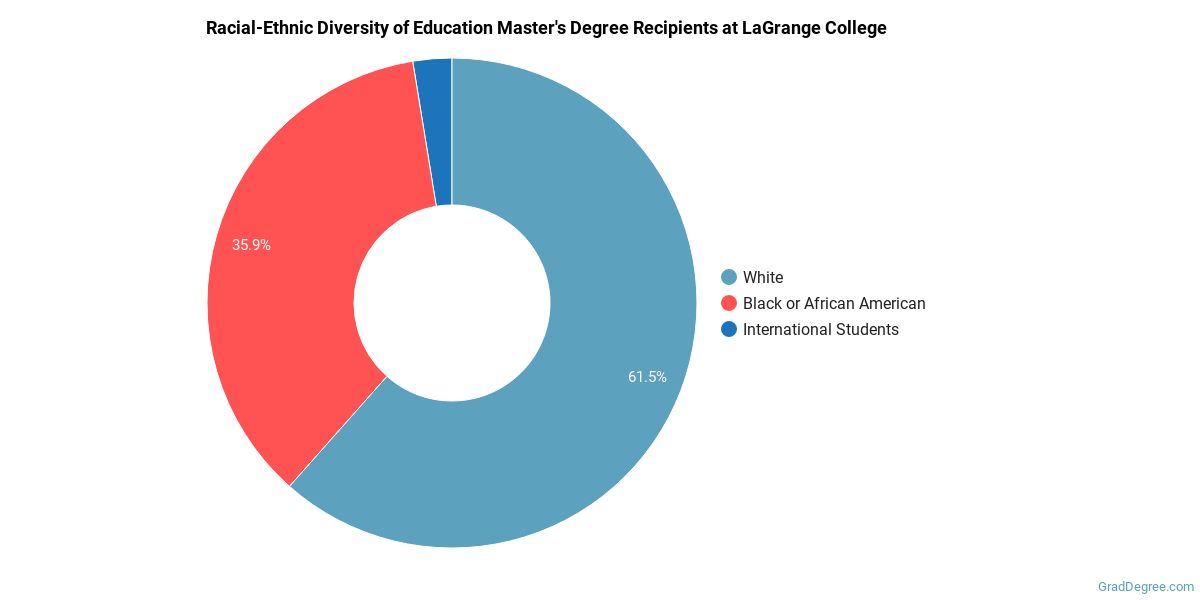 Of the students who received a education master's degree from LaGrange, 62% were white. This is typical for this degree on the natiowide level. In the education master's program at this school, racial-ethnic minorities make up 36% of degree recipients. That is 6% better than the national average.*