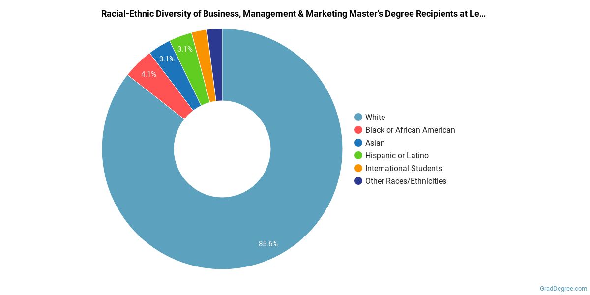 Of the students who received a business, management and marketing master's degree from LeMoyne, 86% were white. This is above average for this degree on the natiowide level.