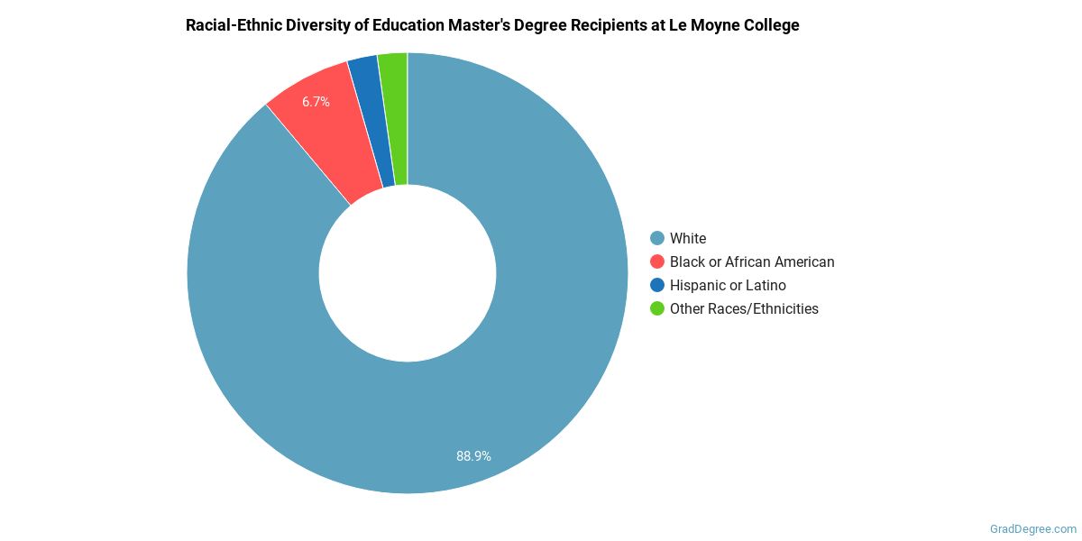 Of the students who received a education master's degree from LeMoyne, 89% were white. This is above average for this degree on the natiowide level.