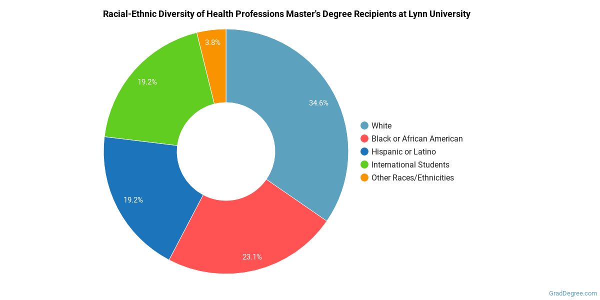 The following table and chart show the race/ethnicity for students who recently graduated from Lynn University with a master's in health professions.