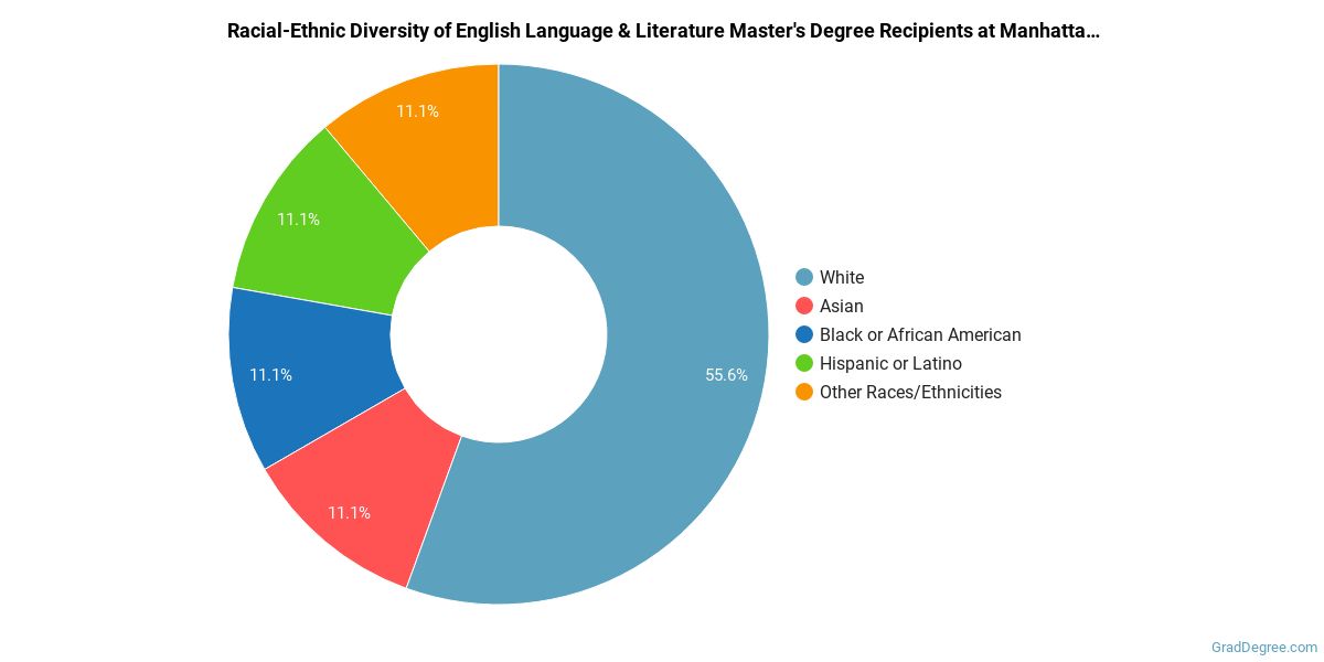 Of the students who received a English language and literature master's degree from Manhattanville, 56% were white. This is below average for this degree on the natiowide level. In the English language and literature master's program at this school, racial-ethnic minorities make up 33% of degree recipients. That is 9% better than the national average.*
