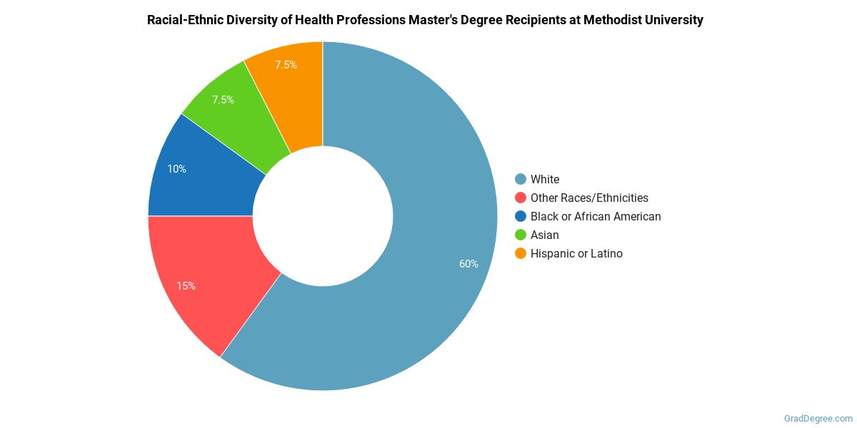 Of the students who received a health professions master's degree from Methodist, 60% were white. This is above average for this degree on the natiowide level.