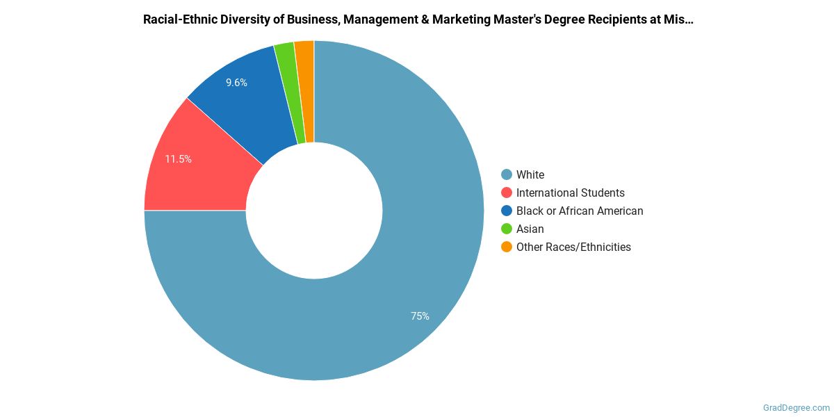 Of the students who received a business, management and marketing master's degree from MBU, 75% were white. This is above average for this degree on the natiowide level.