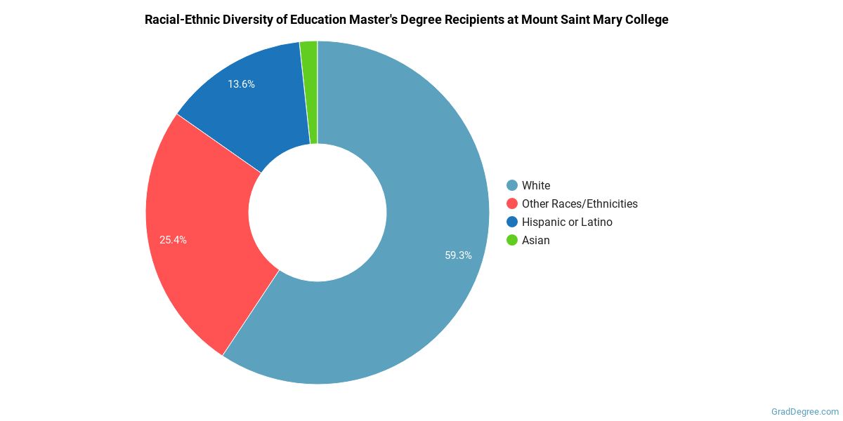 Of the students who received a education master's degree from Mount Saint Mary, 59% were white. This is typical for this degree on the natiowide level.