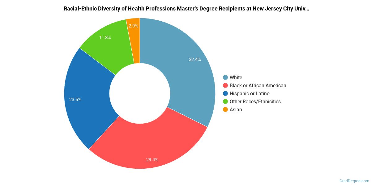 The following table and chart show the race/ethnicity for students who recently graduated from New Jersey City University with a master's in health professions.
