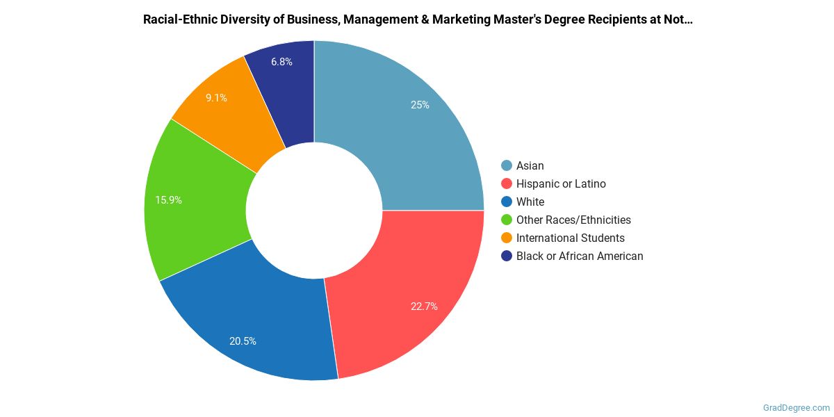 The following table and chart show the race/ethnicity for students who recently graduated from Notre Dame de Namur University with a master's in business, management and marketing.
