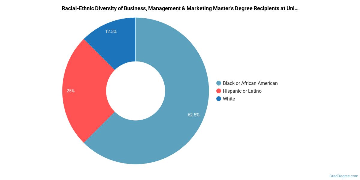 In the business, management and marketing master's program at this school, racial-ethnic minorities make up 88% of degree recipients. That is 56% better than the national average.*